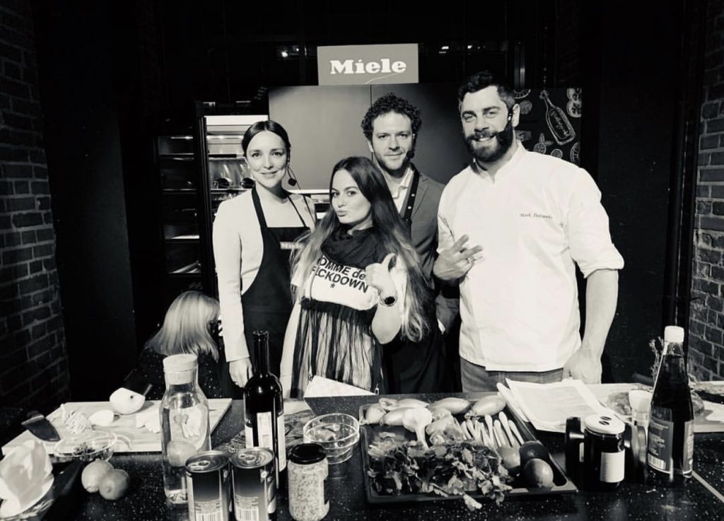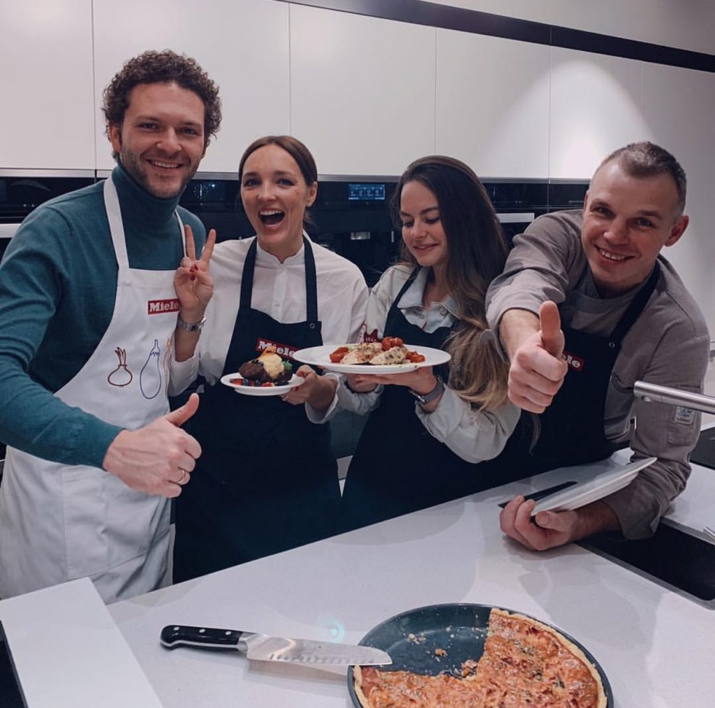 Мероприятие Miele Kitchen Experience в Москве. На фото Варвара Котенко, PR эксперт MOVIE Communication group со звездной парой Константином и Алиной Крюковыми и Амбассадором бренда Miele, Шеф-поваром Марком Стаценко